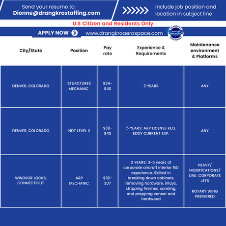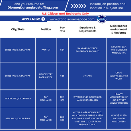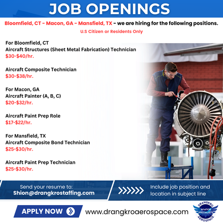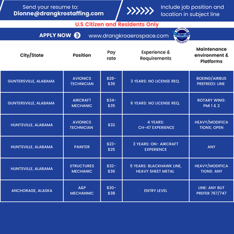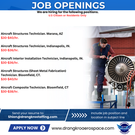 Drangkro Aerospace is an Equal Opportunity Employer. We are always seeking the brightest talents whose academic background, and/or work experience sets them above the rest and their job skills have prepared them for careers with a leading aviation, technology demanding company. We encourage qualified minority, female, veteran and disabled candidates to apply and be considered for open positions.